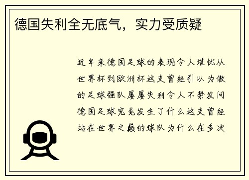 近年来,德国足球的表现令人堪忧。从世界杯到欧洲杯,这支曾经引以为傲的足球强队屡屡失利,令人不禁发问:德国足球究竟发生了什么?这支曾经站在世界之巅的球队,为什么在多次国际大赛中屡屡遭遇打击,实力备受质疑?