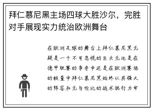 在欧洲足球的舞台上,拜仁慕尼黑无疑是一个不可忽视的巨头。无论是在德甲联赛的争夺中,还是在欧洲赛场的较量中,拜仁慕尼黑始终以其强大的阵容和无与伦比的战术执行力,牢牢占据着一席之地。而这一次,拜仁慕尼黑在主场迎战沙尔,以一场精彩的4-0大胜,再一次向全世界证明了他们的实力和统治力。