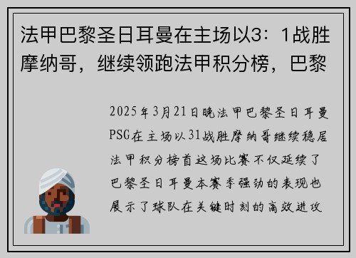 2025年3月21日晚,法甲巴黎圣日耳曼(PSG)在主场以3:1战胜摩纳哥,继续稳居法甲积分榜首。这场比赛不仅延续了巴黎圣日耳曼本赛季强劲的表现,也展示了球队在关键时刻的高效进攻与稳固防守。