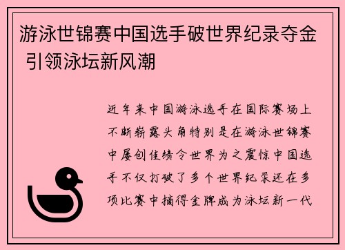 中国游泳选手在世锦赛上破世界纪录、夺金的现象,展现了中国泳坛崛起的强大势头。从技术创新到训练体系的完善,再到人才培养机制的革新,所有这些因素共同推动了中国游泳的快速发展。中国选手不仅在个别项目上打破世界纪录,还在多个项目上实现了突破,展现了中国体育的强大竞争力。