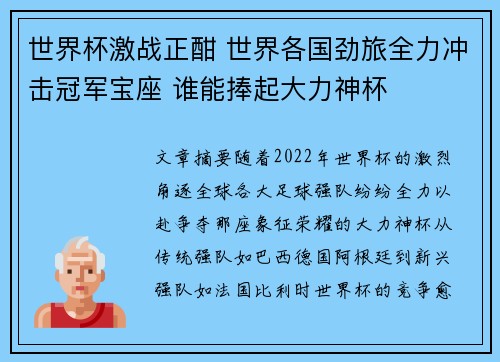 文章摘要:随着2022年世界杯的激烈角逐,全球各大足球强队纷纷全力以赴,争夺那座象征荣耀的大力神杯。从传统强队如巴西、德国、阿根廷到新兴强队如法国、比利时,世界杯的竞争愈加激烈。这场球场上的盛宴不仅是球员的拼搏,也是战术、技术、体能与心理的全面较量。各国球队为了捧起那座具有深厚历史意义的奖杯,展现了他们的实力与决心。无论是夺冠热门的巴西,还是逆袭的法国、阿根廷,各支球队都充满了不可预测的可能性,而谁能最终捧起大力神杯,成为全球焦点。本篇文章将从多个角度深入分析世界杯各队的表现与潜力,探讨今年的世界杯激战到底将花落谁家。