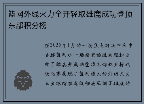 在2025年1月的一场焦点对决中,布鲁克林篮网以一场精彩的胜利轻松击败了雄鹿,并成功登顶东部积分榜。这场比赛展现了篮网强大的外线火力,三分球精准高效,彻底压制了雄鹿的防线,令对手难以应对。本文将从四个方面详细分析篮网外线火力的爆发及其对比赛的影响。首先,篮网队的外线投篮表现如何助力他们在比赛中占据上风;其次,球队的进攻战术和球员之间的默契配合为外线火力提供了保障;再者,雄鹿防守的漏洞和篮网进攻的针对性策略如何让这场胜利成为可能;最后,篮网登顶东部后所面临的挑战及其未来展望。通过这些细致分析,我们能够更加全面地理解篮网这场胜利背后的深层原因以及他们在接下来的赛季中的潜力。