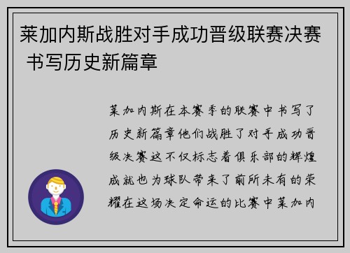 莱加内斯通过战胜对手成功晋级联赛决赛,不仅书写了俱乐部历史的新篇章,也为球队带来了更多的机会与挑战。赛季中的每一场胜利都是球队和球员们付出努力的成果,而战术的灵活调整、关键球员的突出表现以及强大的集体协作精神,则是球队能够突破重重困难、最终晋级决赛的关键因素。莱加内斯的成功不仅属于现在,更属于未来,随着俱乐部的发展壮大,他们有望在更高的舞台上争夺更为丰厚的荣誉。
