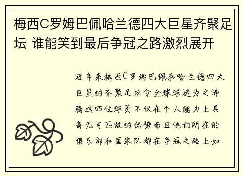 本文将对尤文图斯在意甲联赛中遭遇连败的现状进行详细分析,并探讨梅西与C罗领衔的反弹阵容可能带来的变化。尤文在本赛季的表现出现波动,尤其是在遭遇连败之后,俱乐部的反应显得尤为关键。本文将从四个方面详细阐述:1)尤文连败的原因分析;2)梅西与C罗的角色和影响;3)反弹阵容的构建;4)未来展望和可能的解决...